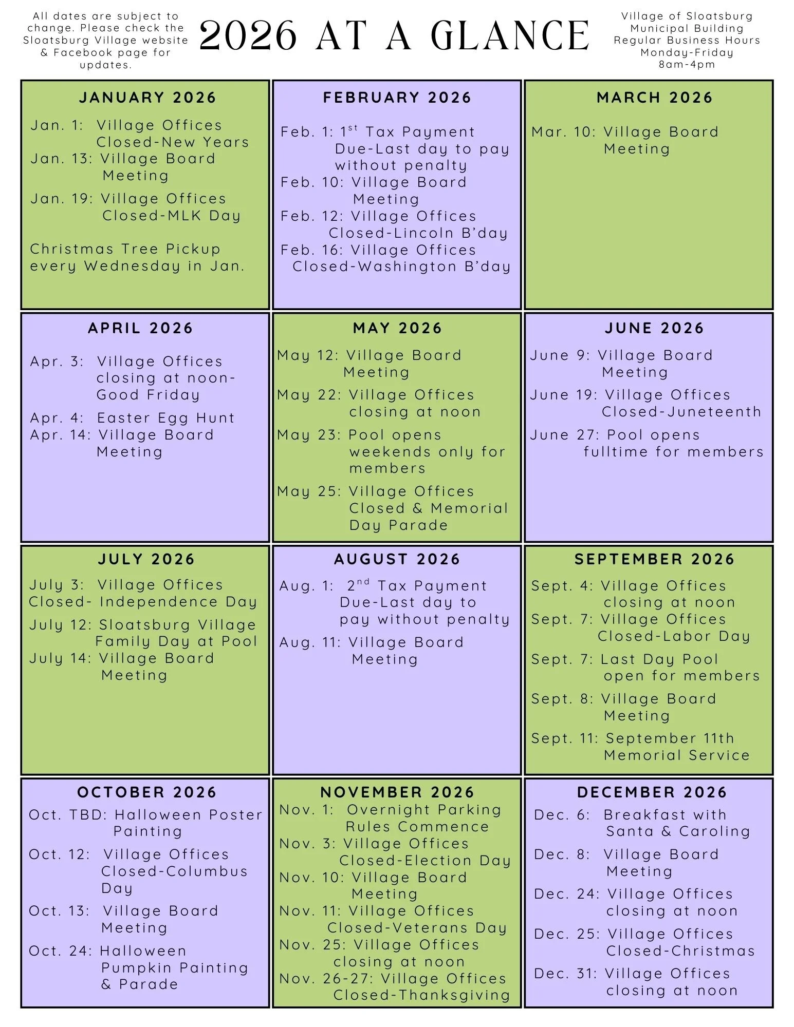 Sloatsburg Village residents will soon be receiving their 2026 "Year at a Glance" calendar in their mailboxes. In an effort to reduce postage, paper & printing costs the Village will only be sending this yearly calendar highlighting some important village dates. Our event flyers and seasonal updates with more in depth information will still be available on our official Village of Sloatsburg website, as well as on our Facebook page as those events happen throughout the year. QR codes for both the village website and facebook are conveniently printed on the "Year at a Glance" calendar. This flyer also provides the household & yard waste pick up schedule and some frequently requested numbers at your fingertips. As always, the village staff is available Monday-Friday, 8am-4pm to answer any questions about any of the information listed on this yearly calendar. Copies of the "Year at a Glance" calendar will be available at Village Hall should you lose or misplace yours throughout the year. We hope that this yearly calendar helps residents plan for the year, as well as provide some useful information all in one convenient flyer.