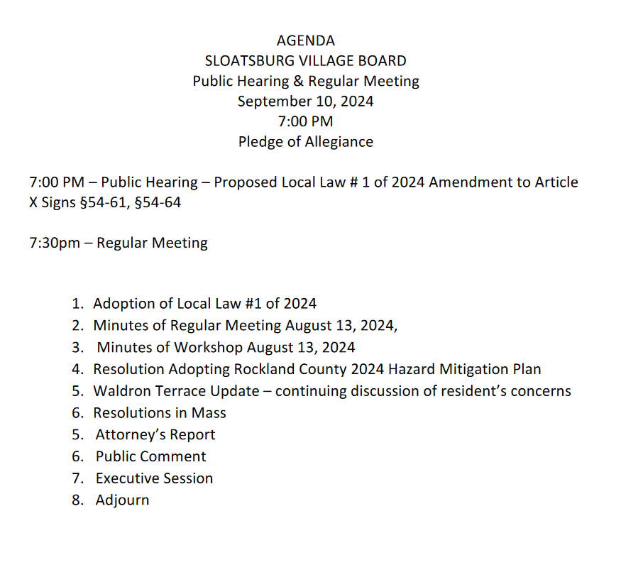 Public Hearing – Proposed Local Law # 1 of 2024 Amendment to Article X Signs §54-61, §54-64 & Monthly Village Board Meeting Sep 9 Written By Guest User Guest User