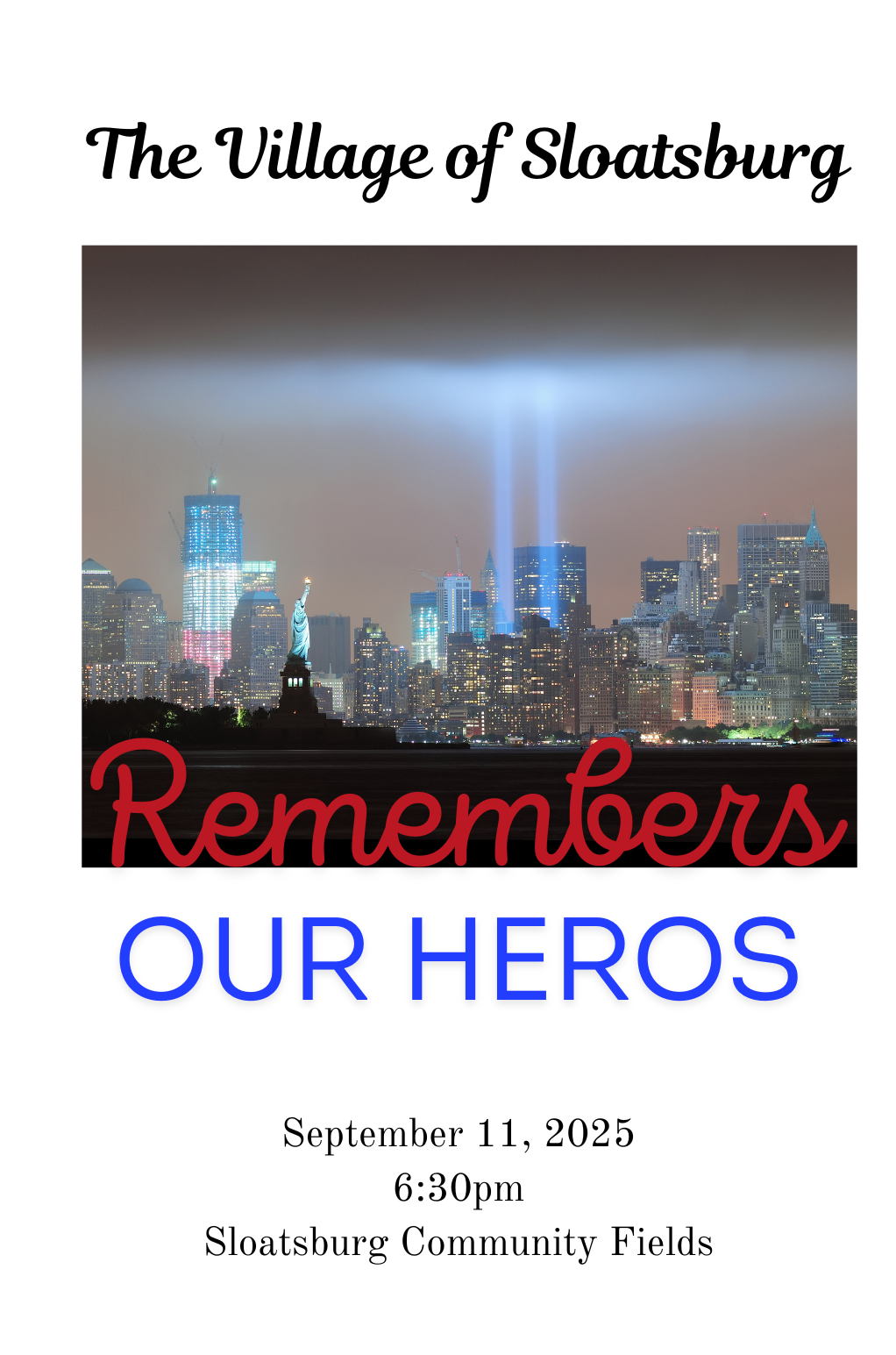 This is a day for reflection, prayer, and remembrance. The Village of Sloatsburg will hold a memorial service on Thursday, September 11, 2025. This ceremony will be held at The Sloatsburg Community Fields Pavilion commencing at 6:30pm. After the ceremony we invite all participants and attendees to a small reception with light refreshments.