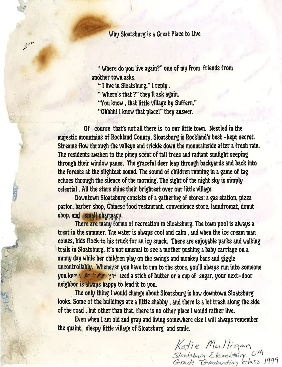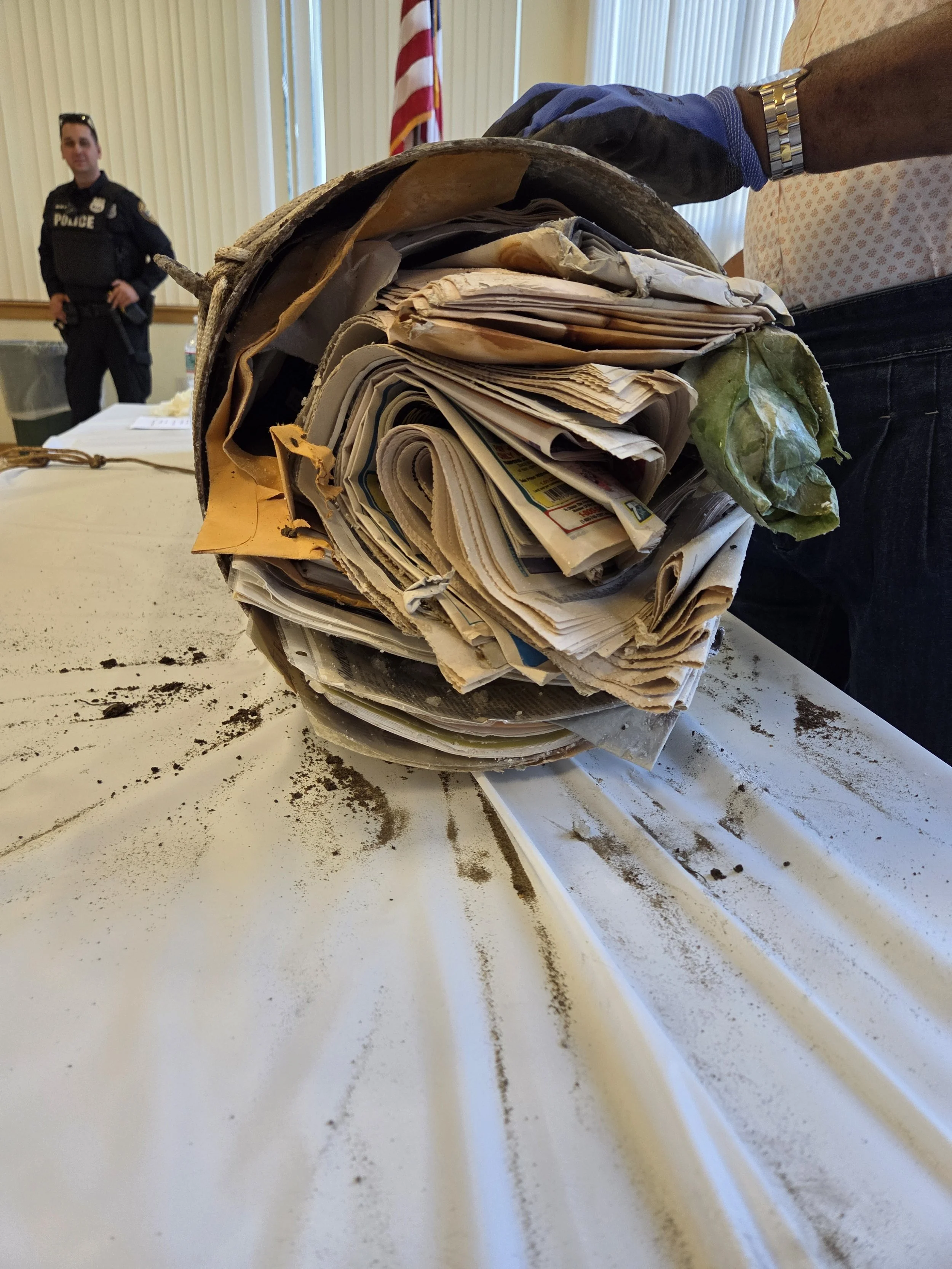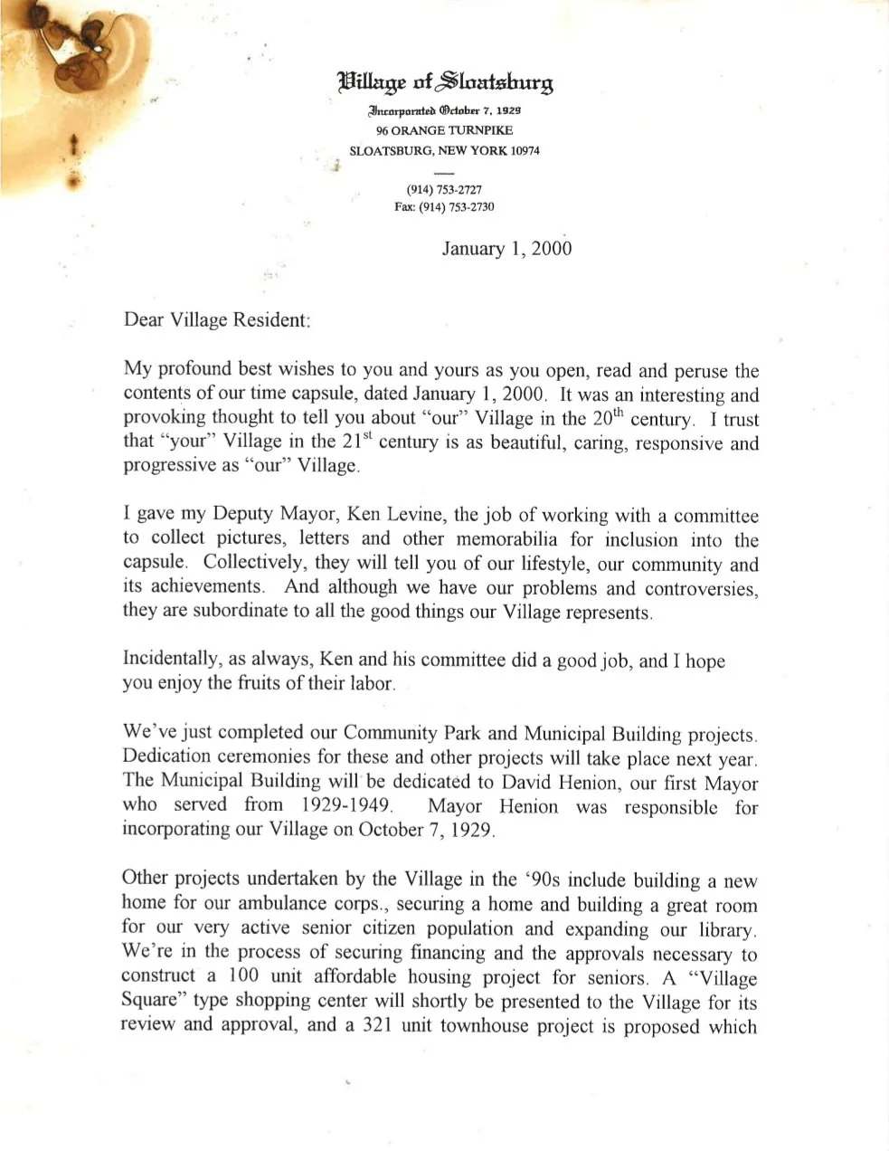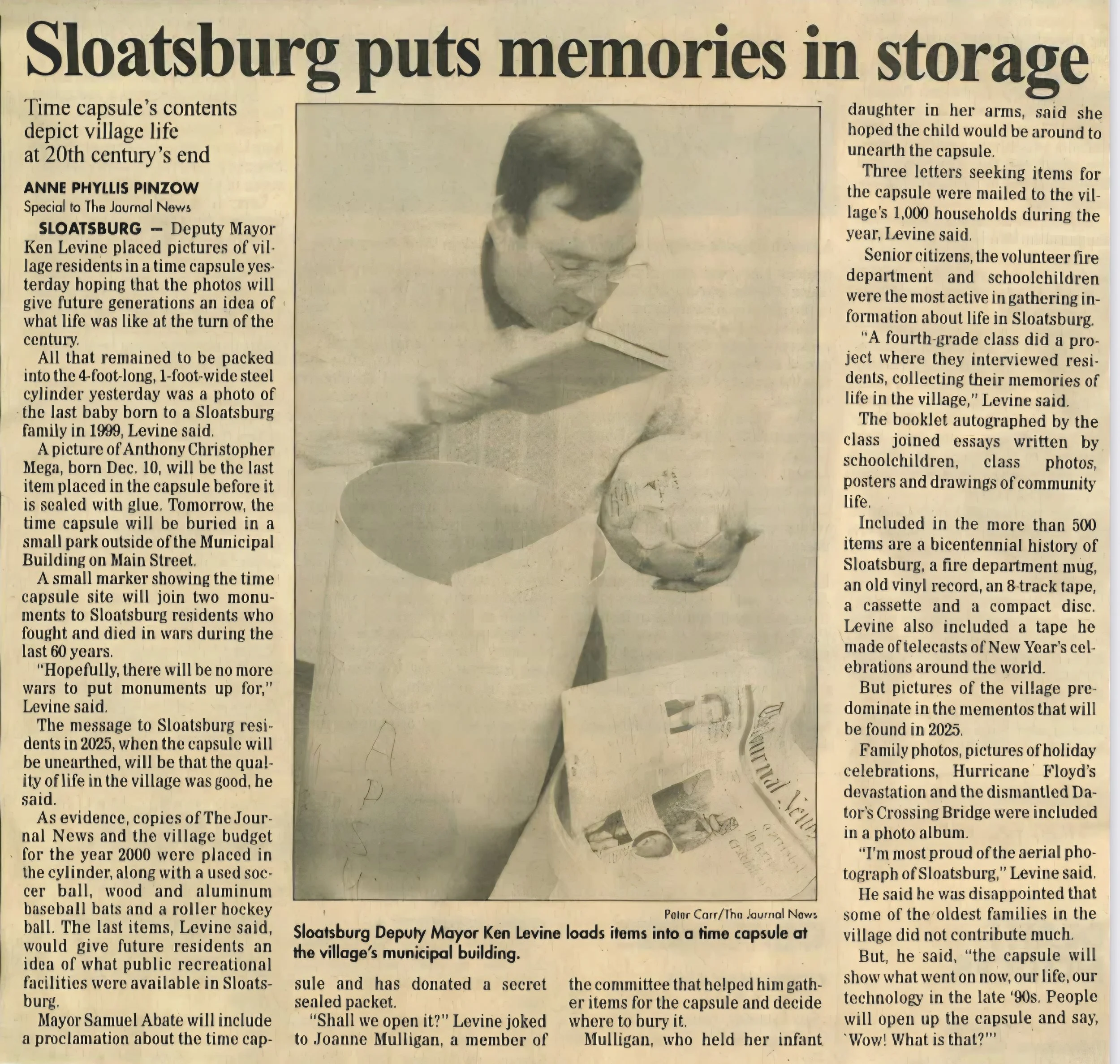 On Sunday, October 5th, the Village of Sloatsburg opened a time capsule that had been sealed and buried on January 1, 2000. During the opening ceremony, Village Historian Mayor Wright spoke about the importance of preserving history, his deep love for the community, and what makes the Village of Sloatsburg such a special place. Mayor Frasier, Trustees Bonkoski and Bitterman, as well as Recreation Clerk Natasha Swanson were present as the time capsule was unearthed and opened after 25 years underground. Photos of then-DPW Superintendent Mike DeMartino preparing the site for the capsule's placement were included, along with a group photo of the original Time Capsule Committee—Joanne Mulligan, Jane Thompson, Richard Graesser, Mike DeMartino, Eileen Lynch, Richard Kastor, and Ken Levine (not pictured Edward Cahoon & Keith Garrison)—posing proudly with the sealed capsule before it was buried. Among the most touching finds were letters from then-Mayor Abate and Deputy Mayor Levine, written to future residents of Sloatsburg. In their messages, they expressed hope that “our” village was still the same beautiful, caring place as “their” village had been. And 6th Grade Essay writer Katie Mulligan gave us a glimpse at why Sloatsburg has been, and in our maybe slightly biased hearts and minds, will always be, A Great Place to Live. Although many items suffered water damage over the years, the contents offered a fascinating glimpse into the Village’s past. The capsule included student projects from Sloatsburg Elementary, family and community event photos, Village meeting minutes, memos, and newsletters. Businesses and community organizations also contributed items to ensure their role in village life was remembered. A wide variety of media formats were included—newspapers, magazines, periodicals, vinyl records, cassette tapes, and VHS tapes—each reflecting a piece of life in the year 2000. Thank you to the Sloatsburg Public Library where many of the recovered items are currently on display for a limited time. We’re already looking forward to creating a new time capsule with the community for Sloatsburg’s Centennial Celebration in 2029!