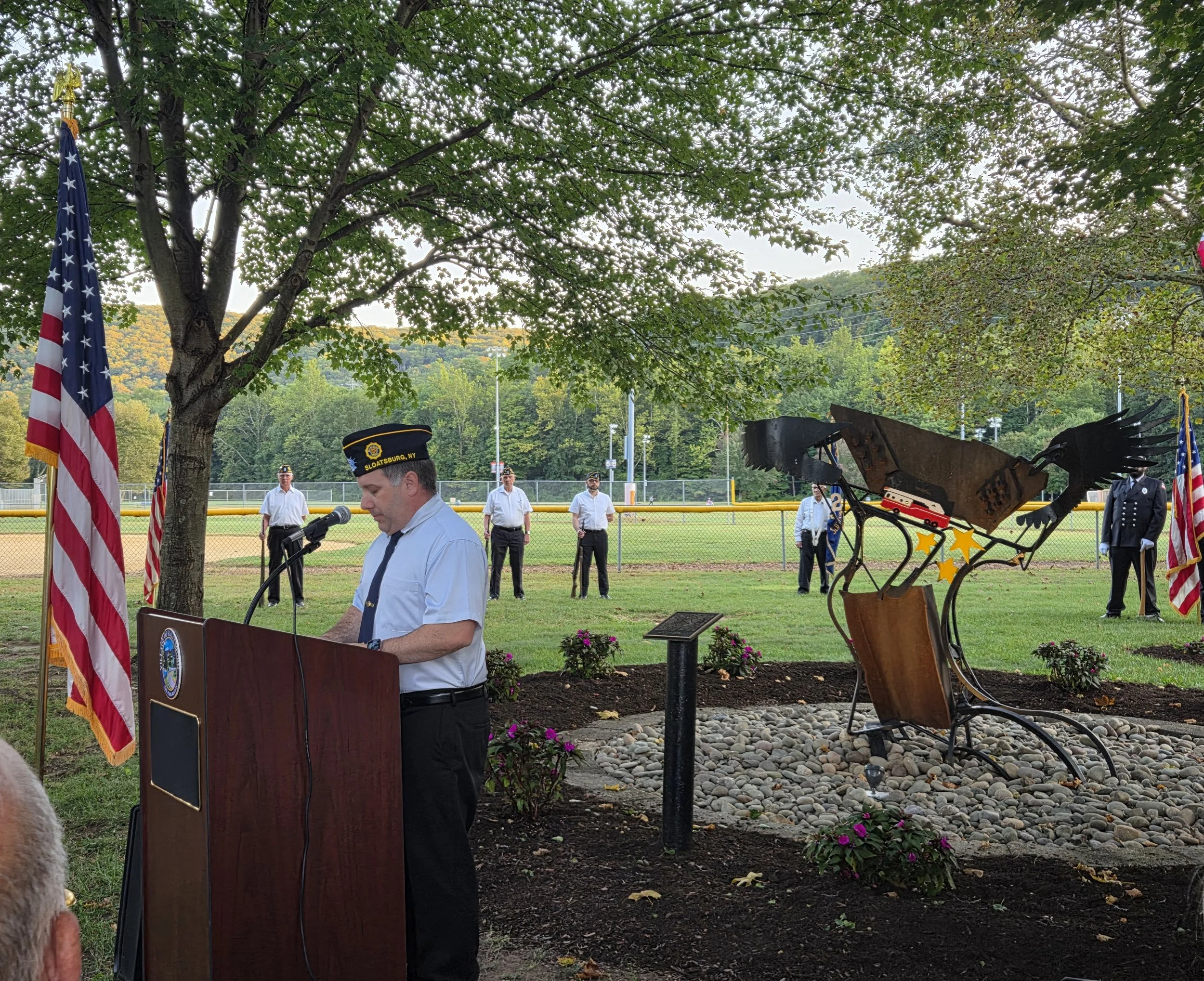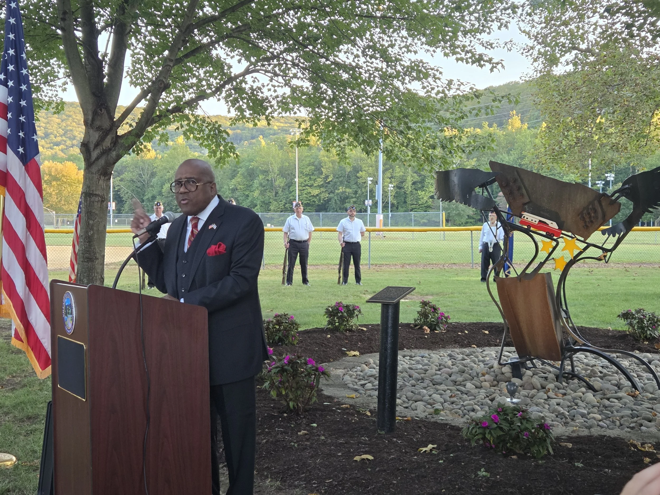 The ceremony took place in front of the 9/11 sculptural monument located at the Sloatsburg Community Fields. The monument stands in remembrance of Denis Patrick Germain, a beloved Sloatsburg resident and dedicated public servant. Denis served as a firefighter with Ladder Company 2 in Manhattan and was also a member of the Tuxedo Fire District Company 2. A seven-year veteran of the New York City Fire Department, Denis is honored not only for his service but for the ultimate sacrifice he made on September 11, 2001. The monument pays tribute to Ladder Company 2 and commemorates the bravery and sacrifice of Denis and all those who lost their lives on that tragic day.