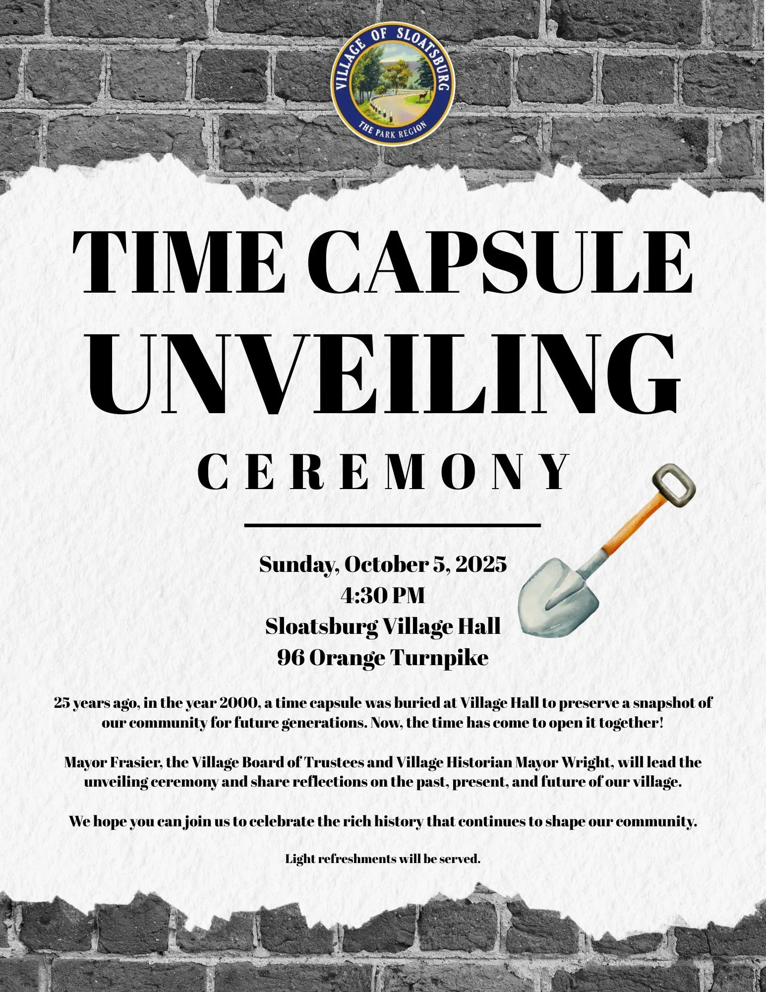 Location: Sloatsburg Village Hall, 96 Orange TurnpikeThe event will include remarks from Village Historian Mayor Wright along with the official opening of the time capsule. Light refreshments will be provided, and all residents are encouraged to attend.