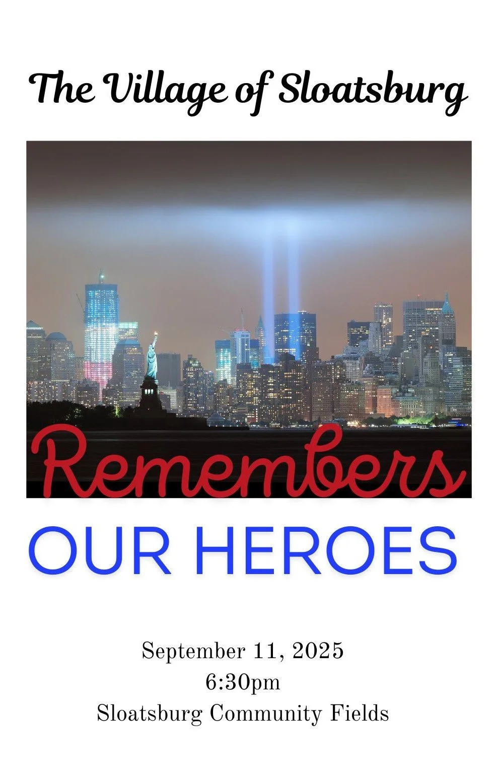The Village of Sloatsburg will hold a memorial service on Thursday, September 11, 2025. This ceremony will be held at the Sloatsburg Community Fields Pavilion commencing at 6:30pm. This is a day for reflection, prayer, and remembrance. The Village invites all residents to take part in this ceremony to remember the men and women that displayed the utmost courage and made the exteme sacrifice to help save others that fateful day. A small reception with light refreshments will follow the memorial.
