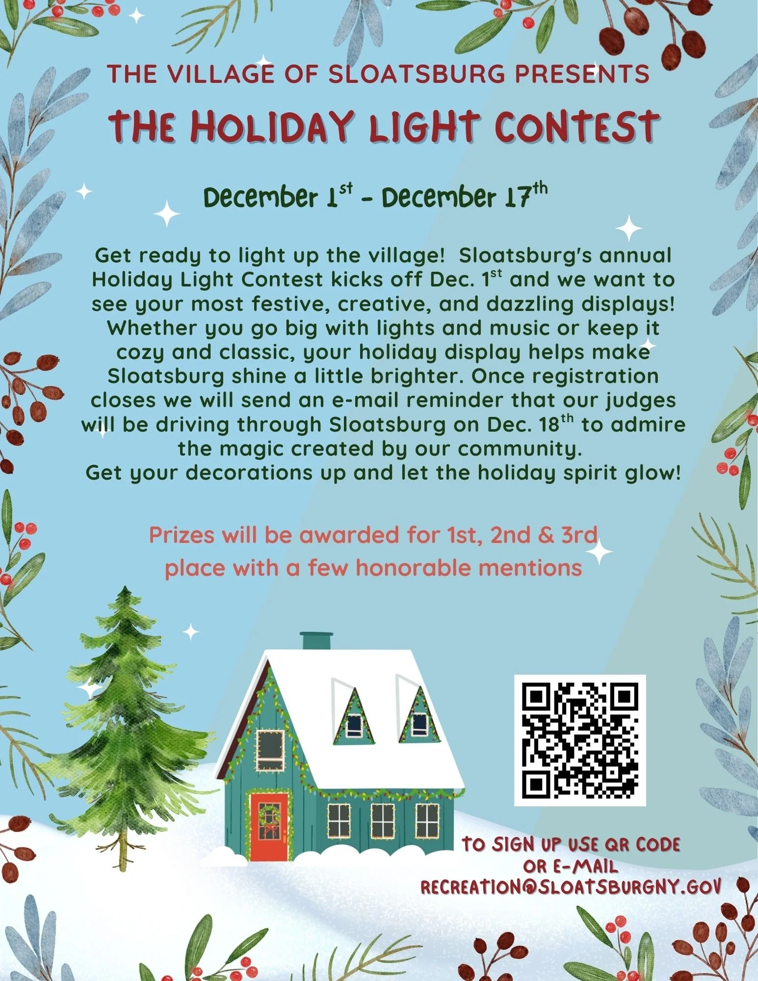 Get ready to light up the village! Sloatsburg's annual Holiday Light Contest kicks off Dec. 1st and we want to see your most festive, creative, and dazzling displays! Whether you go big with lights and music or keep it cozy and classic, your holiday display helps make Sloatsburg shine a little brighter. Register to have your house on our elves list to keep an eye on. Once registration closes we will send an e-mail reminder that our judges will be driving through Sloatsburg on Dec. 18th to admire the magic created by our community.