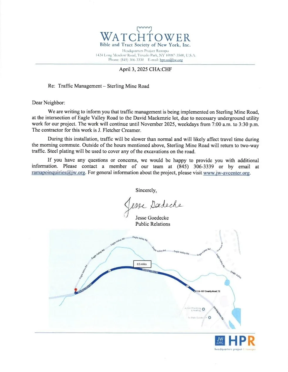 There will be ongoing roadwork on Sterling Mine Road at the intersection of Eagle Valley Road to the David Mackenzie lot, due to necessary underground utility work. This work will continue until November 2025, weekdays from 7am-3:30pm. Traffic will be slower than normal and will likely affect travel time during the morning commute. For additional information please reach out to a member of the Watchtower team listed in the notice posted above.