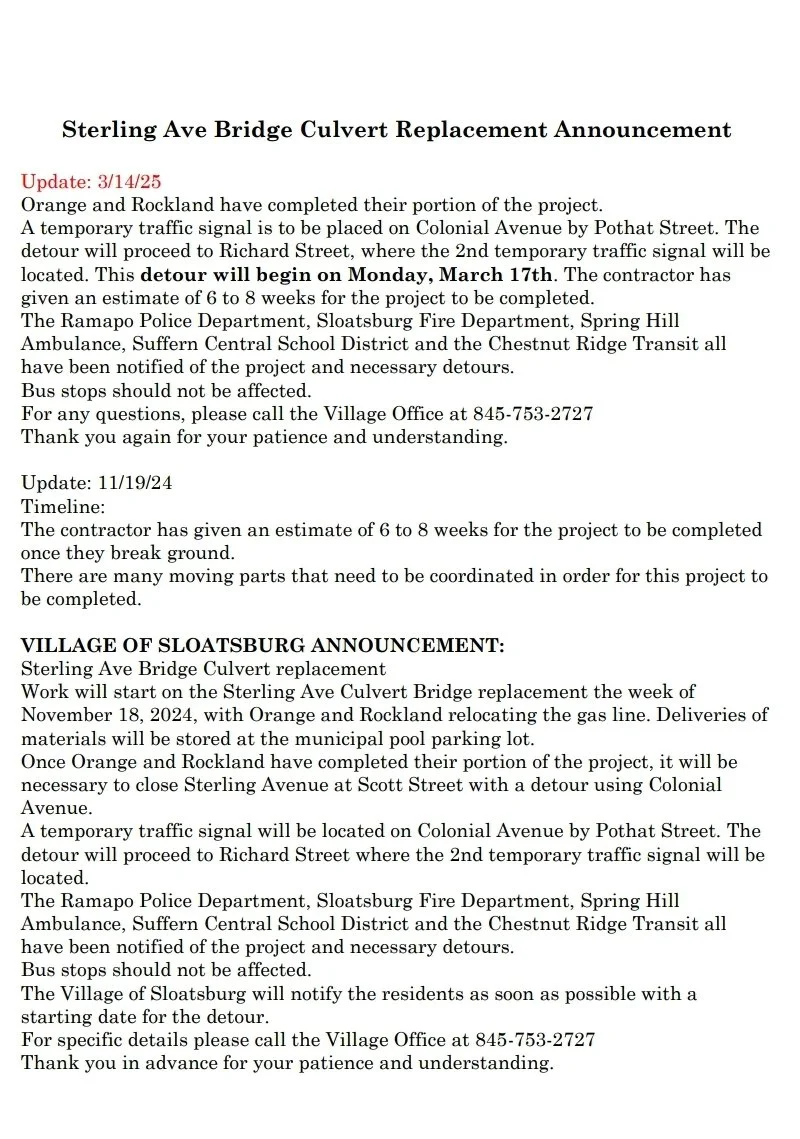 Reminder: this construction is not within the Village of Sloatsburg for any questions or concerns please reach out to the contact listed on the flyer.