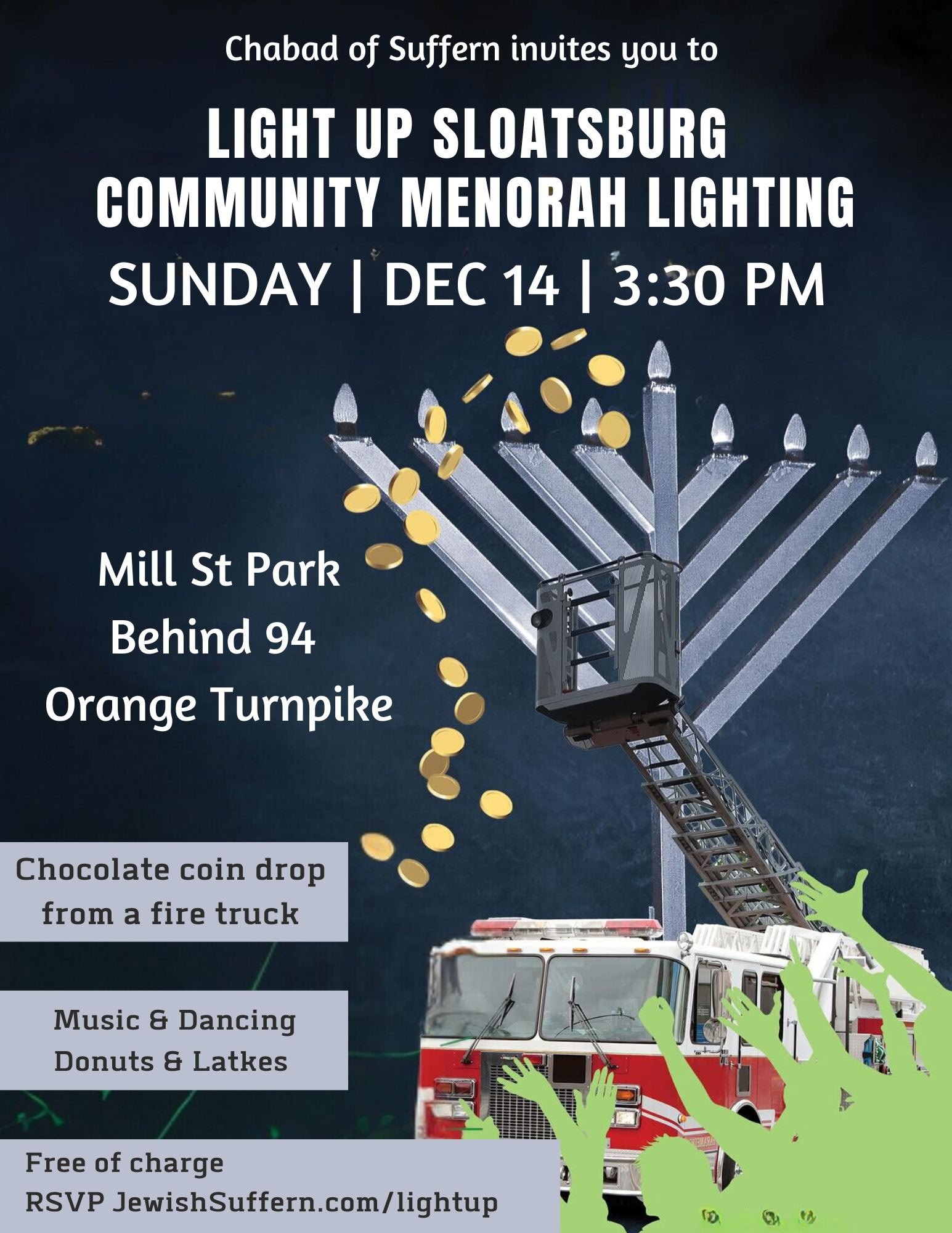 Sunday, December 14th, the Village of Sloatsburg will partner with Chabad of Suffern for our annual Menorah Lighting, with the Sloatsburg Fire Department joining us for a festive chocolate coin drop. This is a free event for all to attend with music, dancing, donuts & latkes!