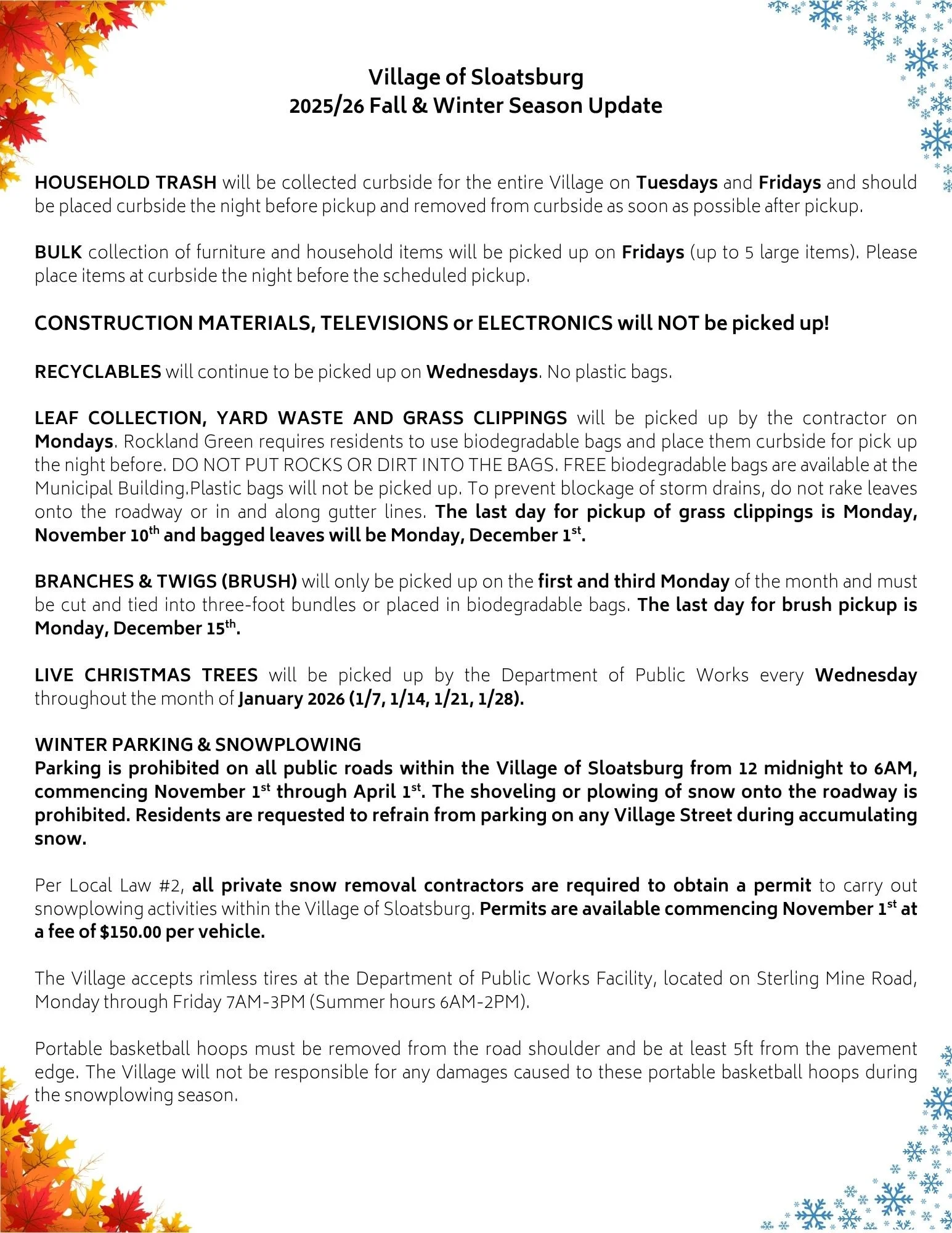 Please note the final pick up dates for grass, leaves and brush listed above. Free biodegradable bags are available at Village Hall during regular business hours for all Sloatsburg residents.